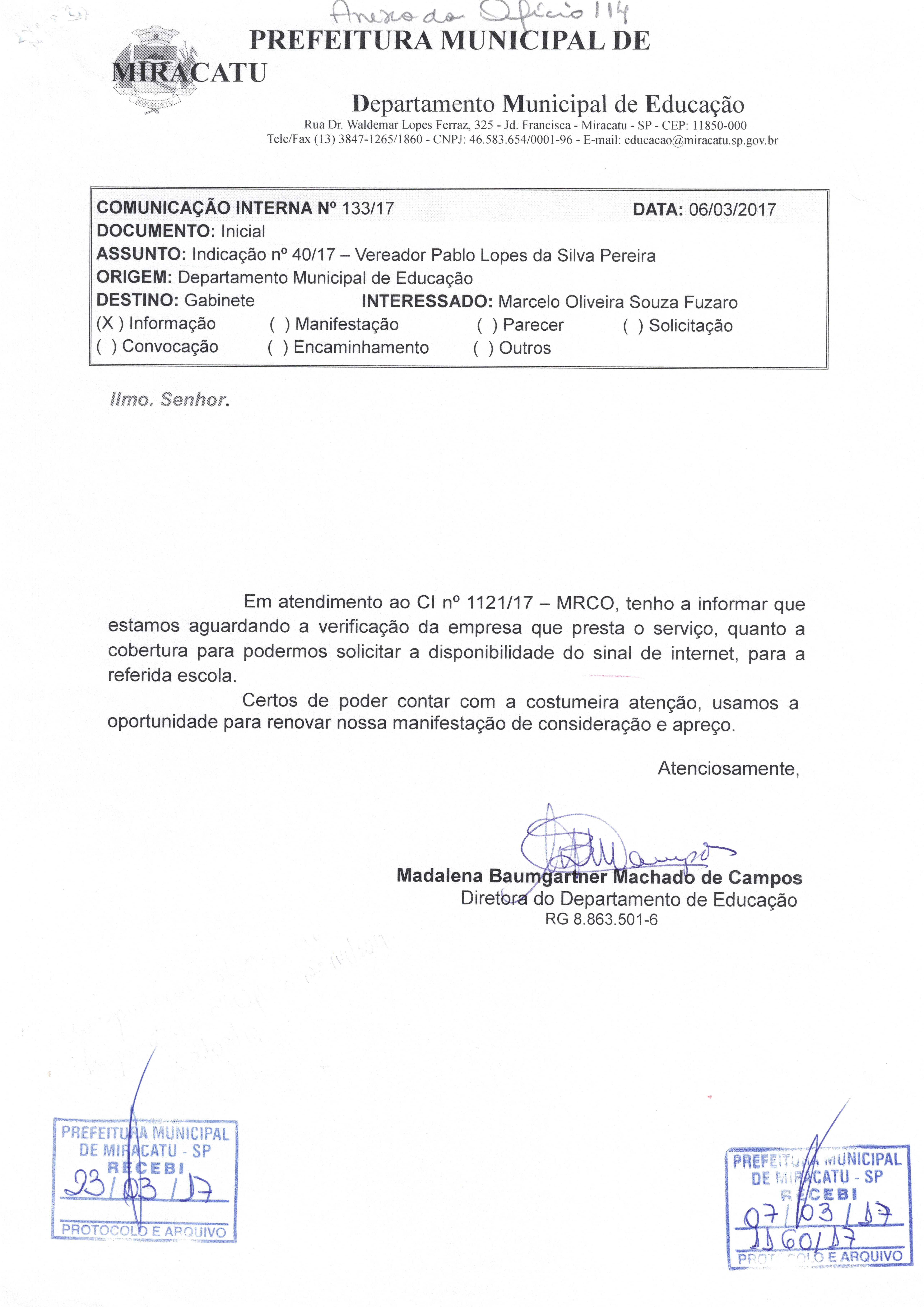 Ofício reposta proposição - registro 358/17 de 23/03/2017 por prefeitura miracatu (Indicação nº 40 de 2017)
