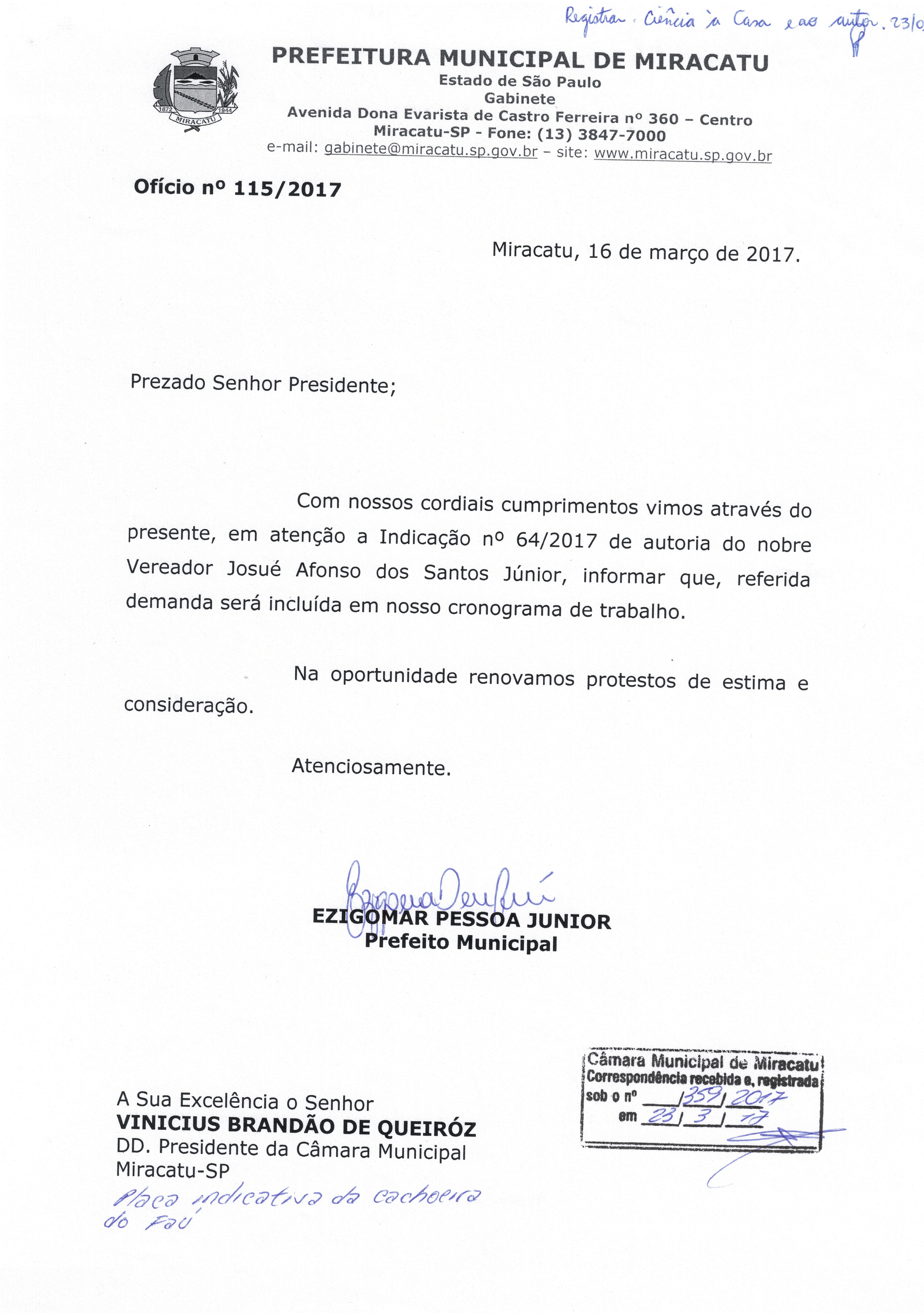 Ofício reposta proposição - registro 359/2017 de 23/03/2017 por prefeitura miracatu (Indicação nº 64 de 2017)