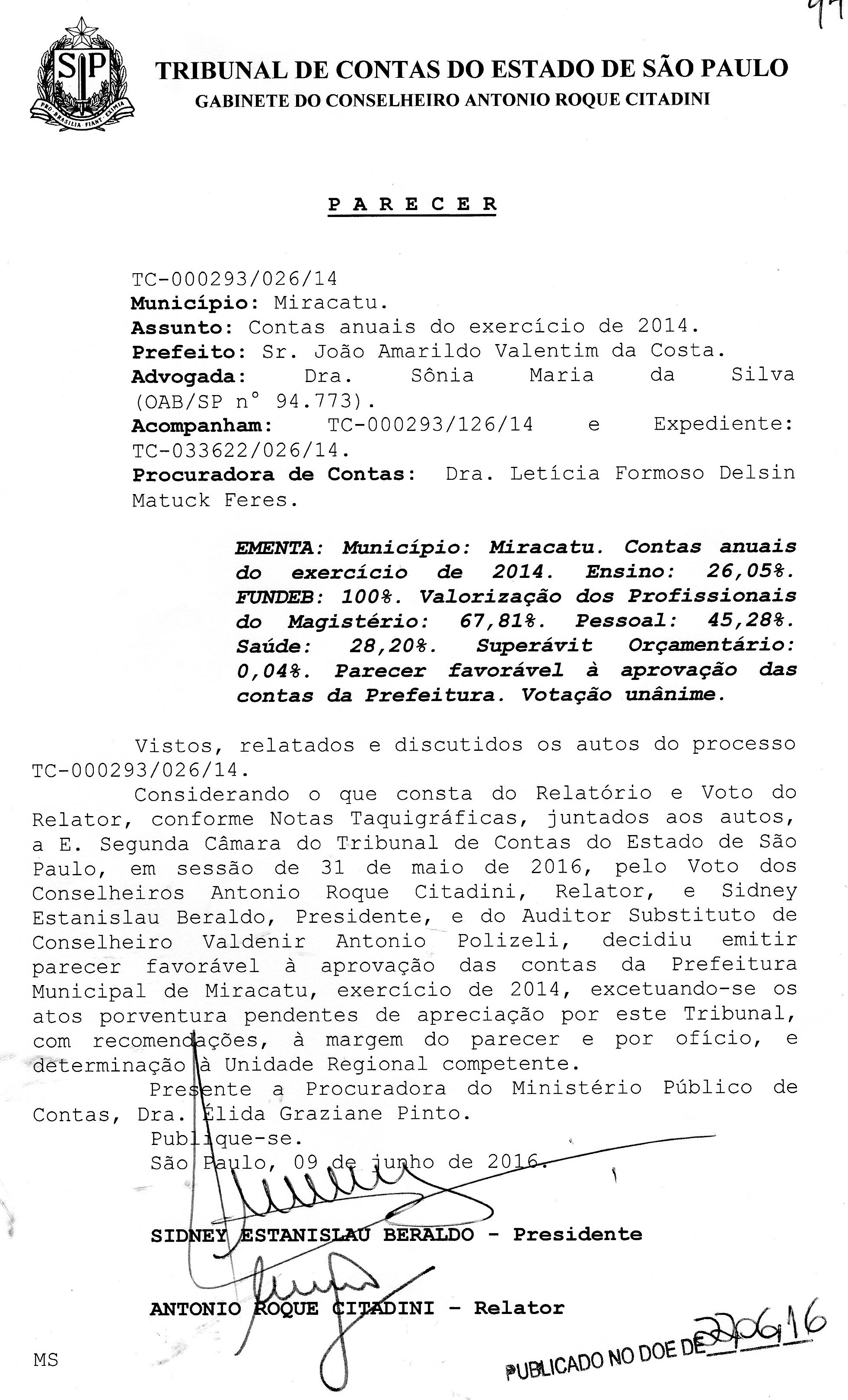 CONTAS DA PREFEITURA MUNICIPAL - EXERCÍCIO DE 2014, CULMINOU COM PARECER FAVORÁVEL TC 0293/026/14 DO TRIBUNAL DE CONTAS DO ESTADO DE SÃO PAULO, EMITIDO EM 09/06/2016 - |